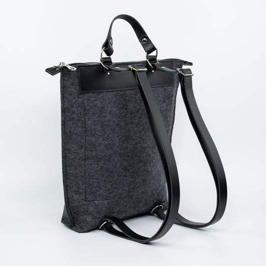 Features include interior and exterior zipper pockets, a full leather base, adjustable straps and a convenient top handle.